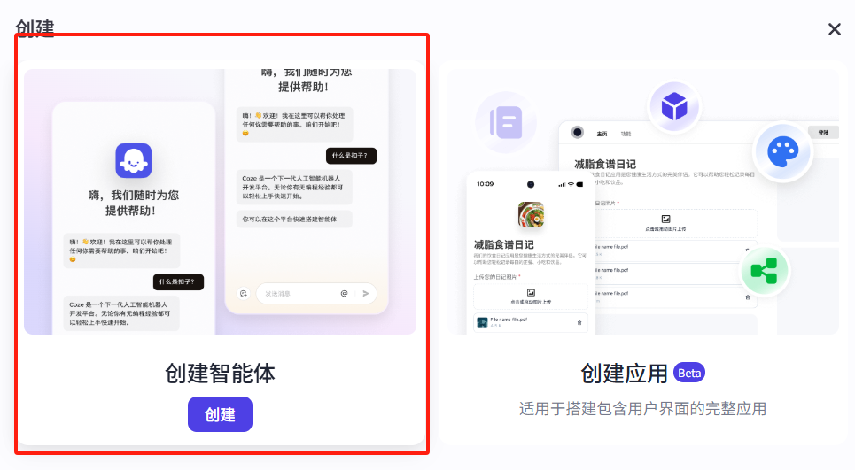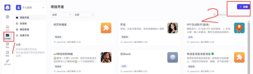 点击工作空间,然后再点击创建,选择创建一个智能体