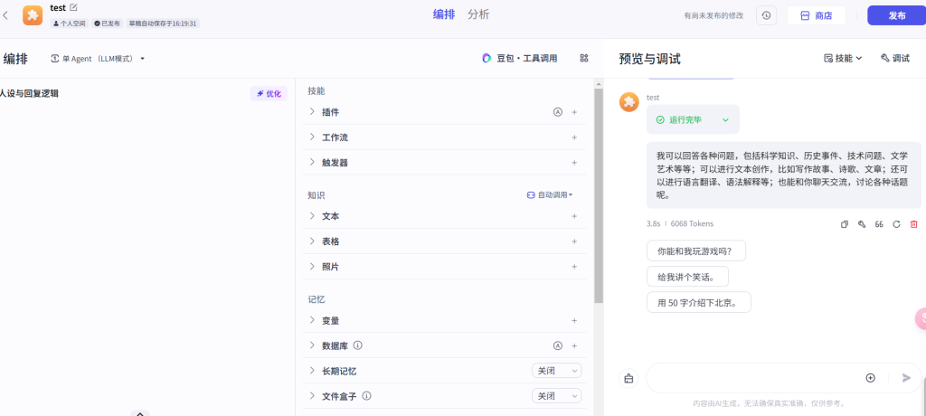 配置完成之后,在右侧测试一下,看看自己的bot是否能够正常对话和回复