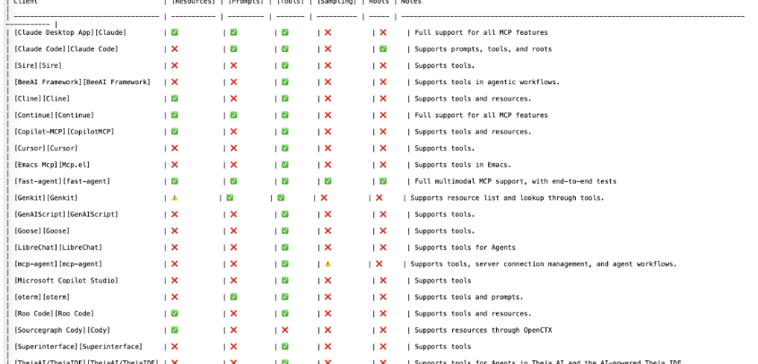 每个客户端可能支持不同的 MCP 功能,从而允许与 MCP 服务器进行不同程度的集成: