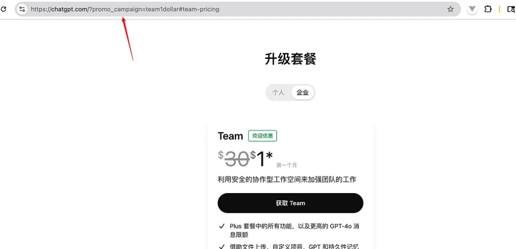 完整的url:https://chatgpt.com/?promo_campaign=team1dollar#team-pricing
