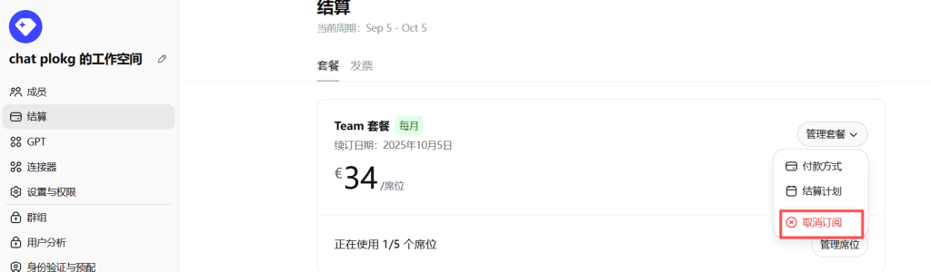 然后点击切换到结算页面,可以看到你已经使用了的席位,以及点击右边的取消订阅。