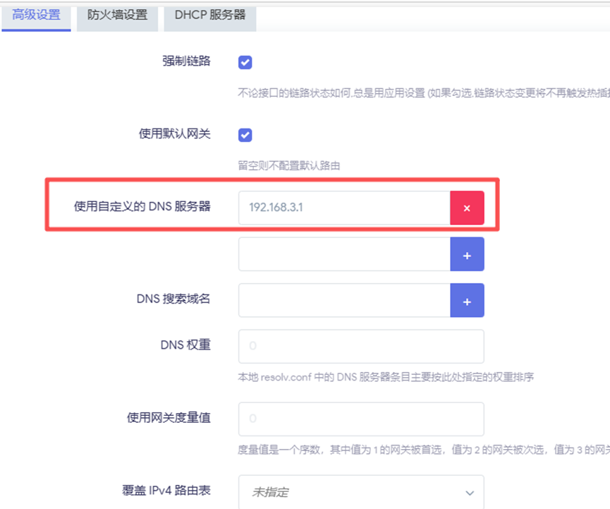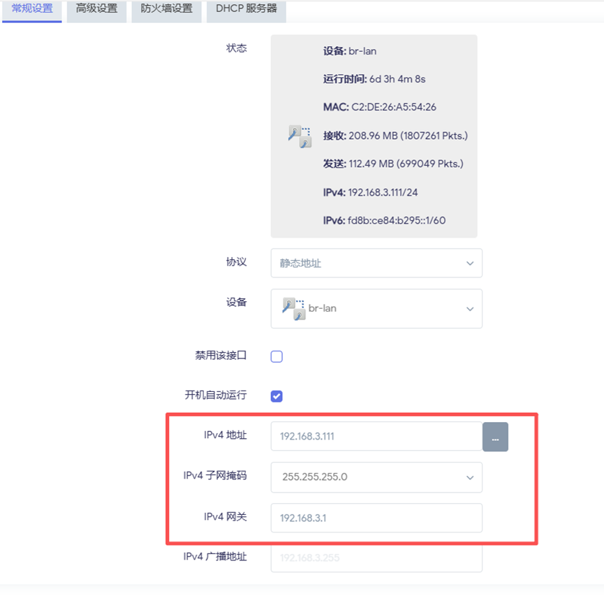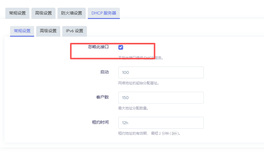 - DHCP接管策略<MARKDOWN>DHCP服务器 → 勾选”忽略此接口” → 禁用所有IPv6选项